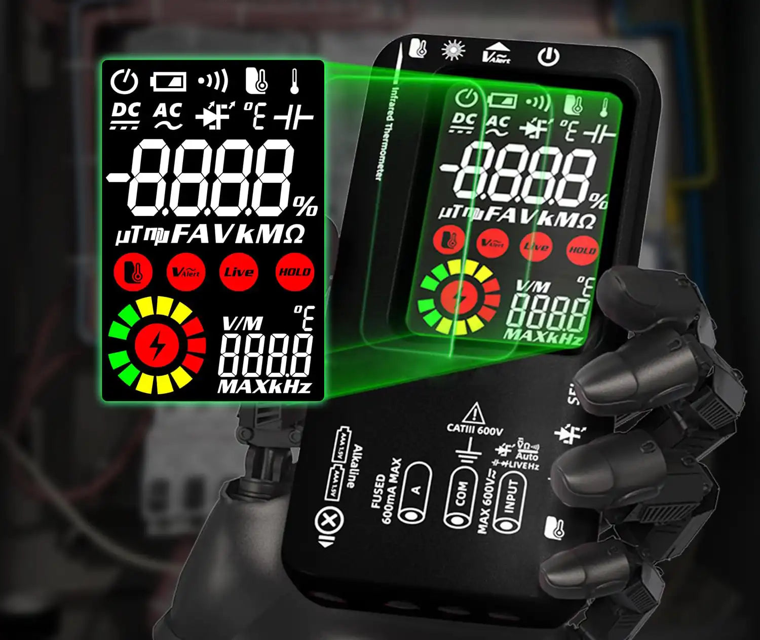 Das Smart Multimeter V2 misst nicht nur elektrische Parameter – es ist auch eine Infrarot-Temperaturpistole. Diese Funktion zeigt gleichzeitig Echtzeit- und Maximaltemperaturen an und wird durch einen Laserpointer zur präzisen Zielidentifizierung erweitert.