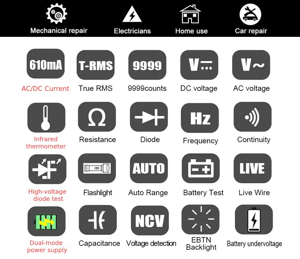 Das Smart Multimeter V2 kann AC/DC-Spannung und -Strom, Widerstand, Durchgang, Hoch- und Niederspannungsdioden sowie Kapazität messen.